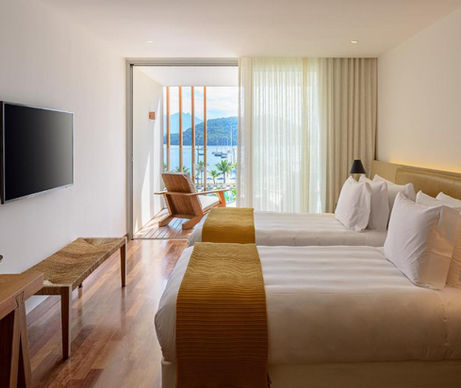 As acomodações foram meticulosamente projetadas para refletir o mais puro conceito de elegância à beira-mar. Com amplas varandas e uma integração perfeita com a natureza, cada ambiente proporciona vistas deslumbrantes, seja para as águas cristalinas ou para o exuberante cenário de montanhas.